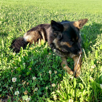 Vor gut einem Jahr habe ich Antonia von Hunde-Menschen-Coaching kennen gelernt. Zusammen haben wir an Seminaren, Online-Kursen und auf dem Platz Hunde und Menschen beobachtet. Sie hat mir die Augen geöffnet und gezeigt wie man Hunde versteht. Was zur folge hat, dass sich unsere Spaziergänge total verändert haben. Früher hiess es 'ich habe eine Stunde zeit, hopp, hopp, los geht's' und im Eiltempo haben wir Kilometer um Kilometer hinter uns gelassen, schliesslich brauchen die Hunde Bewegung und müssen ausgepowert werden. Das war ein Mal, heute sehen unsere Spazottel ganz anders aus...... Schon ganz früh sind wir unterwegs. Ein Hund nach dem anderen kommt aus dem Auto natürlich immer erst wenn er in die Ruhe gekommen ist. Für Nala nicht immer ganz einfach, aber sie gibt sich Mühe. Wie immer heisst es für die ersten paar Meter 'Leine an'. Wir vier stehen neben dem Auto und wollen uns gerade in Bewegung setzen. Da kommt von rechts eine schwarze Katze aus dem Gebüsch und rennt an uns vorbei direkt ins Maisfeld. Für Nala ist der Reiz zu gross - sie fährt fast aus dem Pelz - verkündet lautstark 'das geht nicht, die muss ich stoppen'. Kandro & Gavany, angesteckt von Nalas Energie, sind ganz kurz auch ihrer Meinung. Für die Fellnasen ist doof, dass ich am Ende der Leine hange "nein, es wird hier geblieben". Für Nala ist das Ereignis noch lange nicht gegessen, sie bellt, schreit und zappelt an der Leine rum. Ich stehe einfach nur da und warte bis sie sich beruhigt. Endlich kehrt Ruhe ein und wir können los.... Gaaaaanz langsam schlendern wir der Strasse entlang. Überall gibt es viel zu entdecken, Mäuselöcher, Schmetterlinge, Bienen usw. nicht zu vergessen die vielen Pinkelstellen. Alles wird genaustens inspiziert, gelesen und quittiert nach einer halben Stunde haben wir ca. 500m geschafft. Ja, es ist so, wir sind im Schneckentempo unterwegs und im Rudel herrscht eine wahnsinnige Ruhe keiner muss den anderen korrigieren weil die Energie nicht stimmt. Klar rennen die Vierbeiner auch mal über die Wiese und haben Fun. Zum Beispiel Heute: Nala findet eine grosse Vogelfeder schnuppert kurz dran und läuft weiter. Ganz interessiert inspiziere ich das Teil, nun habe ich die Neugier der Hunde geweckt. Nala beansprucht die kostbare Beute, nimmt sie in den Fang und rennt los, Gavany lässt sich nicht zweimal bitten und steigt ins Spiel ein. Die Beiden rennen über die gemähte Wiese und haben Spass. Immer wieder versucht die Eine der anderen den Schatz abzuluchsen. Nala überschlägt sich und verliert dabei die Feder. sofort schnappt Gavany zu und sichert das kostbare Teil. Nun hat sich das Blatt gewendet..... Nach kurzer Zeit kehren sie mit einem Lächeln im Gesicht zurück und wir schlendern weiter in Richtung Auto. Die Energie der Hunde ist nicht übergeschwappt, alle sind glücklich und zufrieden. Nach 1.5h haben wir einen Kilometer zurück gelegt sind total getschillt und können nun zur Arbeit fahren. Für mich sind solche Spaziergänge wie eine Meditation.